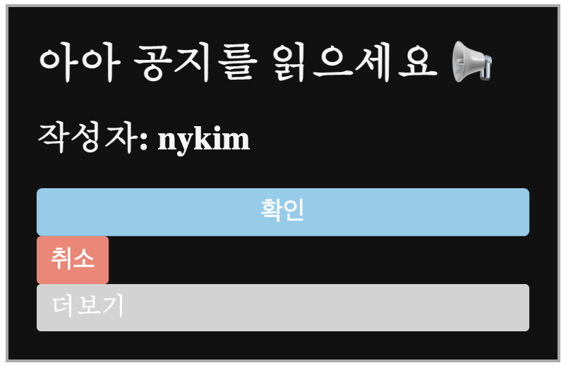 import React from 'react'; import styled from 'styled-components'; function LayerPopup({ title, children, cancelButton, confirmButton }) { return ( <Popup> <PopupContents> <strong>{title}</strong> <p>{children}</p> <div className="buttonGroup"> <button>{cancelButton}</button> <button>{confirmButton}</button> </div> <PopupCloseBtn>팝업 닫기</PopupCloseBtn> </PopupContents> <Dim/> </Popup> ); } LayerPopup.defaultProps = { title: '안녕하세요', children: 'Lorem Ipsum Dolor Sit Amet?', cancelButton: '취소', confirmButton: '확인' }; export default LayerPopup;이제 예쁘게 꾸며줄 시간입니다 🧑🎨