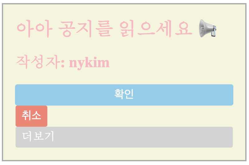${}로 데려와 하위에 작성할 수도 있고요.import styled from 'styled-components'; const Title = styled.div` color: darkolivegreen; h1 { font-size: 30px; margin: 0 0 10px 0; } `; const Notice = styled.div` padding: 20px; border: 2px solid #aaa; ${Title}:hover { color: crimson; } `; const Button = styled.button` display: block; padding: 6px 10px; color: #fff; font-size: 18px; border-radius: 3px; background-color: crimson; border: 0; &:hover { background-color: teal; } `; function App() { return ( <div> <Notice> <Title> <h1>아아 공지를 읽으세요 📢</h1> <h2>작성자: nykim</h2> </Title> <Button>확인</Button> </Notice> </div> ); } export default App;4-2-2. 확장하기
