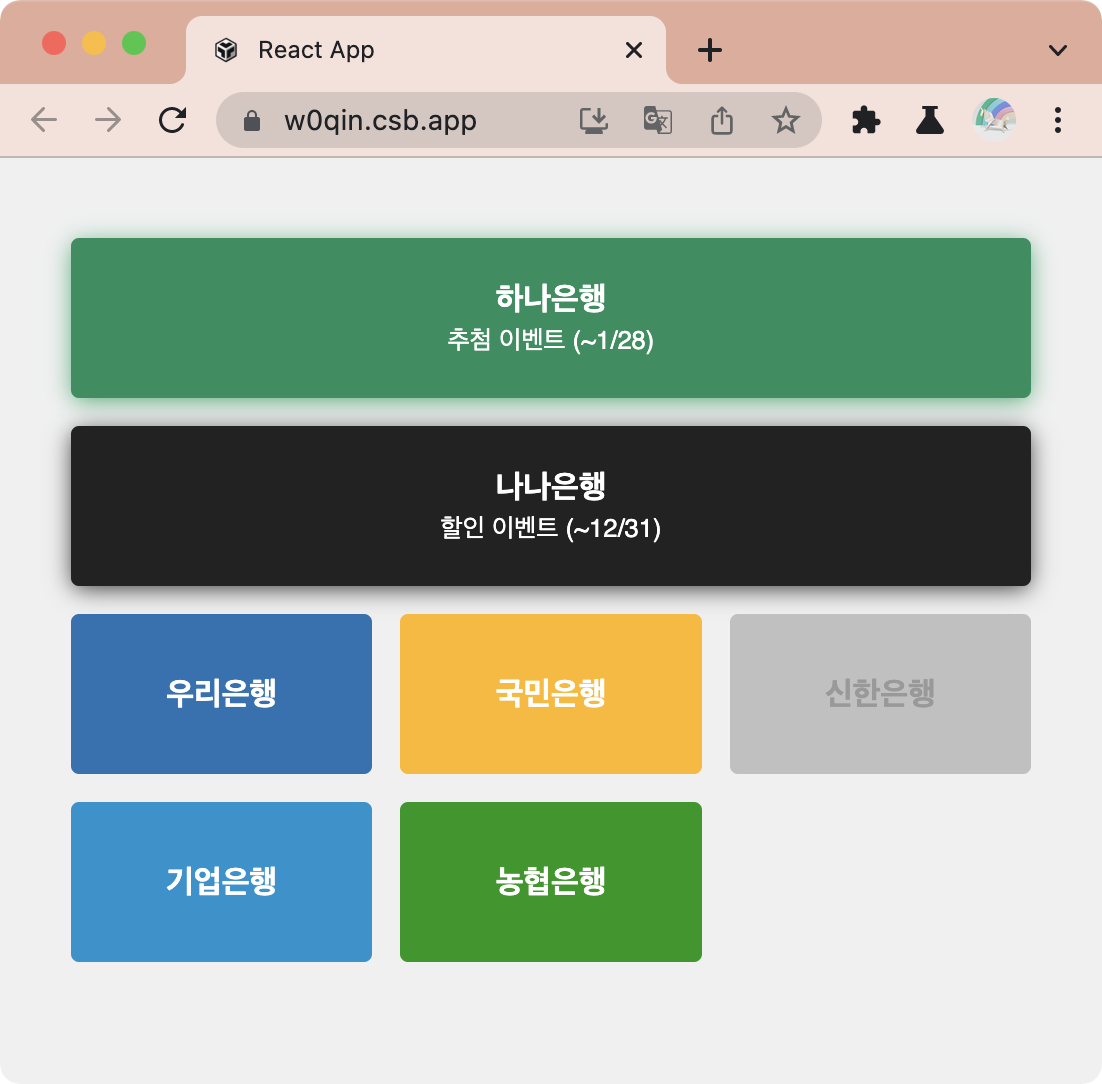 import React from 'react'; import styled, { css } from 'styled-components'; import { darken } from 'polished'; const bankColors = { wr: '#2172b2', kb: '#fdb810', hn: '#0d905d', default: '#222222' }; const BankButton = styled.button` //... ${(props) => { const color = bankColors[props.name] || bankColors['default']; return css` //.... `; }} //... `; function Bank({ children, ...rest }) { return <BankButton {...rest}>{children}</BankButton>; } export default Bank;Grid CSS를 활용해 보기 좋게 App.js를 다듬고, 유지보수성 테스트를 위해 은행 몇 가지를 추가해봤습니다.