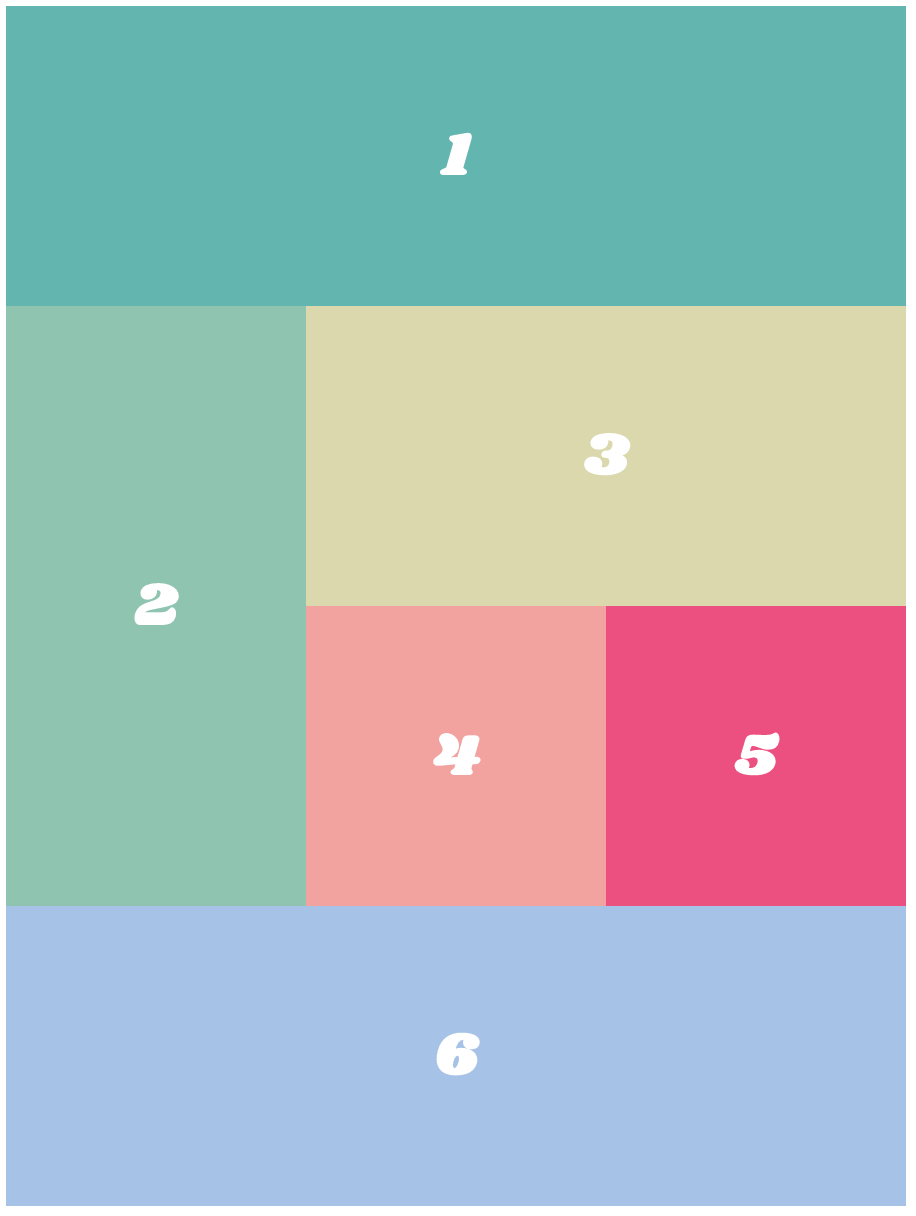 .item1 { grid-column: 1 / 4; } .item2 { grid-row: 2 / 4; } .item3 { grid-column : 2 / span 2; } .item6 { grid-column : 1 / span 3; }