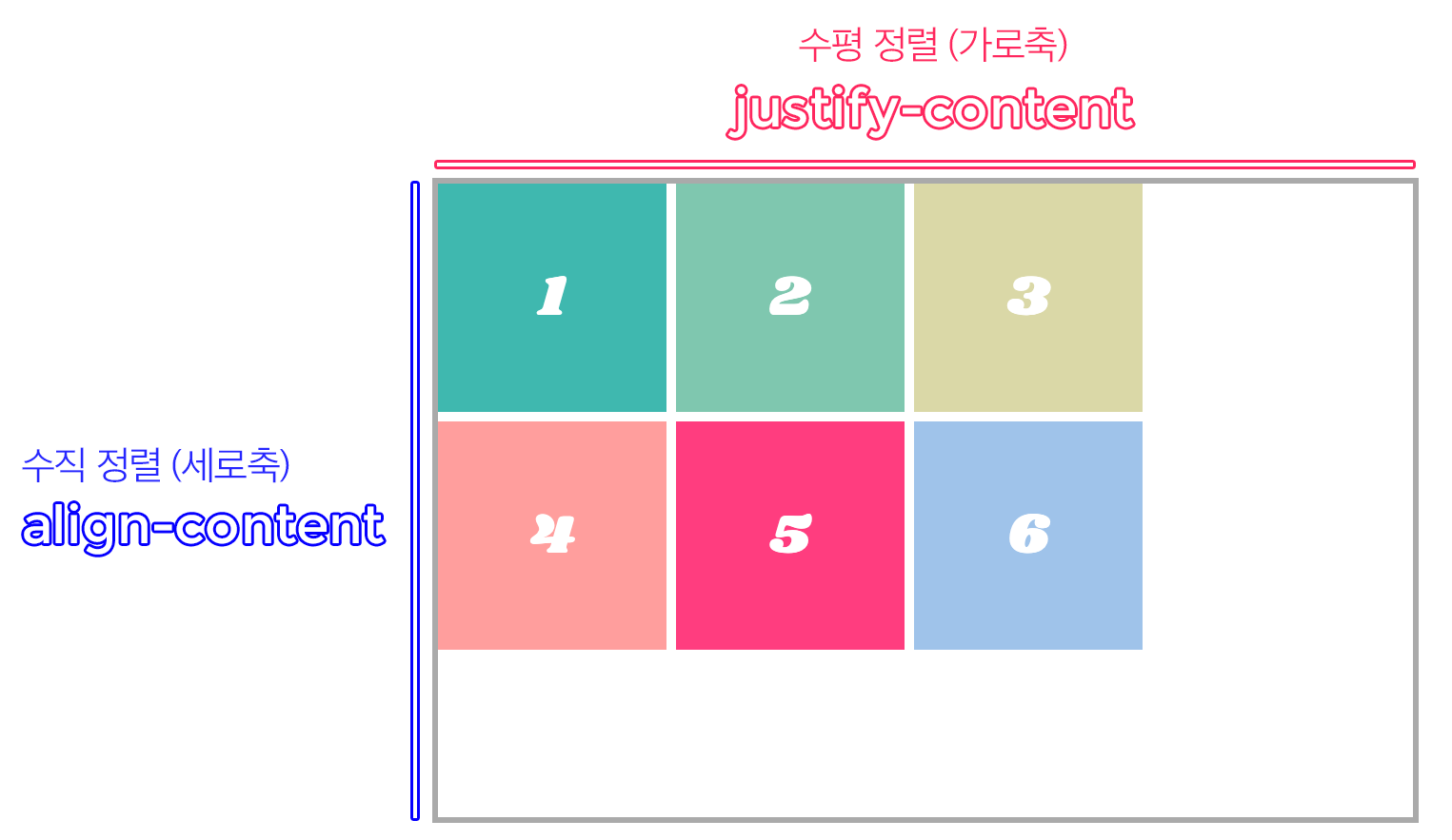 세로축으로 정렬하는 align-content와 가로축으로 정렬하는 justify-content까지 기능이 같습니다.